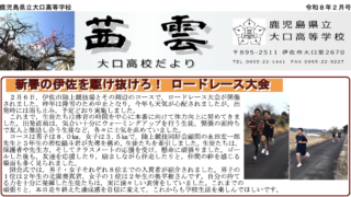 大口高校 「茜雲」1月号の紹介 大口高校東京同窓会の皆さま,明けましておめでとうございます。今年もどうそよろしくお願いします。さて,ふるさと伊佐では,今年は郷土の英雄である新納忠元公生誕500周年を迎え、様々なイベントが計画されており、年間を通して大いに盛り上がっていこう... 2026.01.22 大口高校